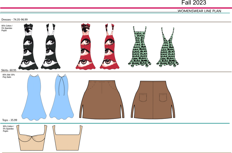 The target market that I chose for this design collection are college art women who are wanting to elevate their closet further for the fall. It gets a bit harder when it gets colder outside to properly dress for the hourly changing weather throughout the day. The best way to solve this is to have some layering with basic staples with statement pieces. In my Escapism collection, it will be providing those statement pieces that they have been looking for. With flowy dresses, skirts and small tops, they can be easily paired with winter cowboy boots, leather jackets, black tights, and a fashionable scarf. Other stores are also creating this look for consumers as well. Urban Outfitters would be the biggest competition for this collection as they have pieces that are “dedicated to inspiring customers through a unique combination of product, creativity and cultural understanding.” However, with my collection of Fall 2023 Escapism, my target market will be able to purchase these pieces for an affordable price and have a long product life cycle.